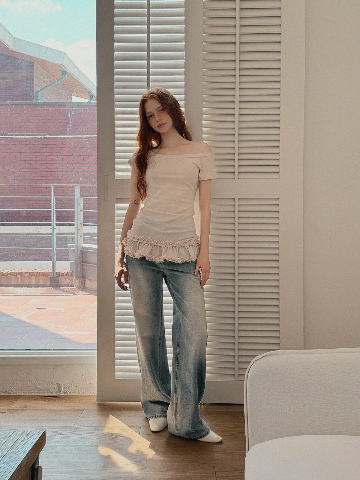 Beige Frill Off-Shoulder Short Sleeve Tee